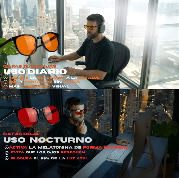 Aunque apagues las luces, tu cerebro sigue recibiendo señales de “día” a través de pantallas y luz LED. La luz azul y verde retrasa la producción natural de melatonina y mantiene tu sistema nervioso en alerta.